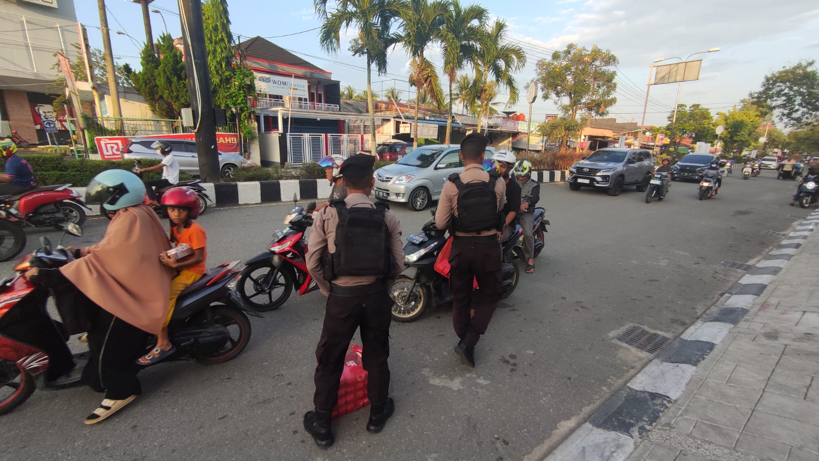 ”Hari ini kami berinisiatif untuk membagi makanan siap saji kepada masyarakat dan karyawan perusahaan yang pulang kerja dan melintas disekitar simpang 3 Ramayana” ujar Ipda Tri Sartono