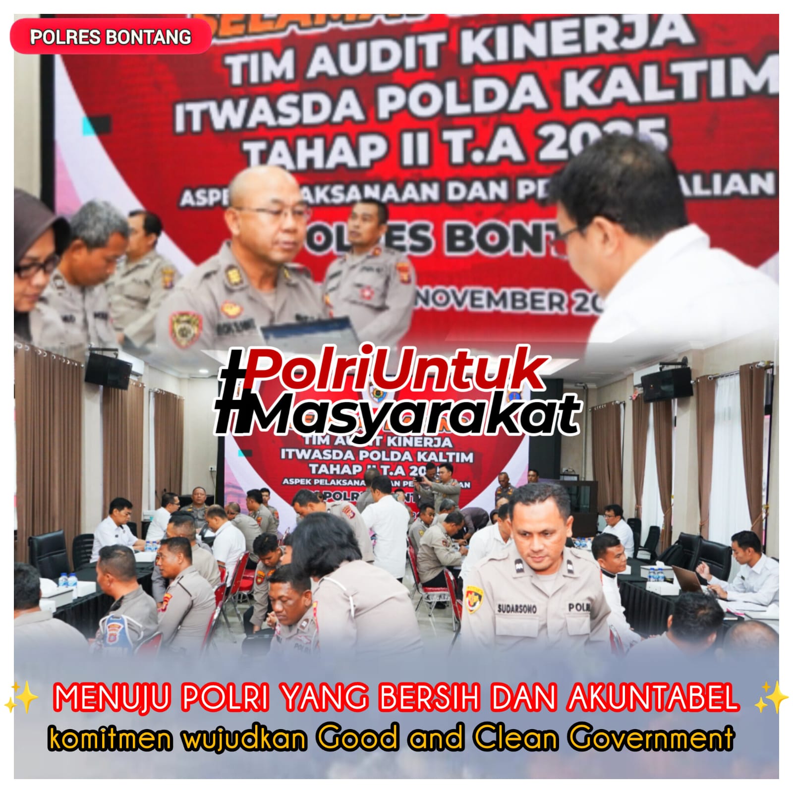 Audit dipimpin Kombes Pol Jepri Yuniardi, S.I.K., M.H. selaku Ketua Tim, dan diterima Kapolres Bontang AKBP Widho Anriano SIK, MSi. Audit ini merupakan bagian dari upaya Polri untuk memastikan pelaksanaan tugas dan pengelolaan sumber daya di jajaran kepolisian berjalan sesuai prinsip Good and Clean Government — yakni pemerintahan yang transparan, akuntabel, efisien, dan berintegritas tinggi.