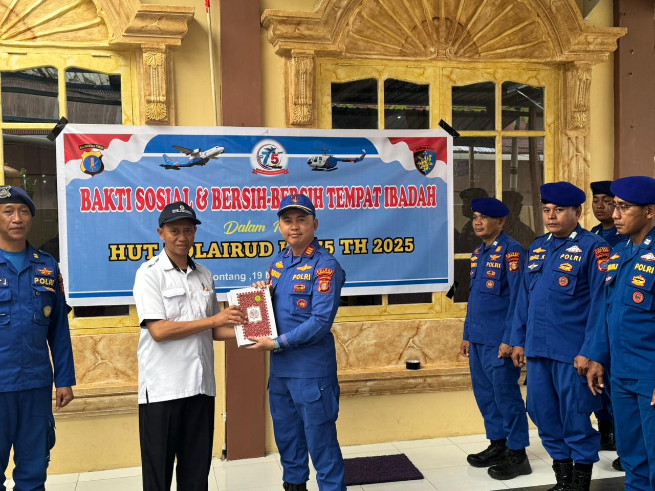 Dipimpin oleh Kasat Polair Polres Bontang, AKP Fahrudi, S.H., M.H., personel melaksanakan pembersihan area masjid serta menyerahkan bantuan kitab suci Al-Qur’an dan peralatan kebersihan kepada pengurus masjid.